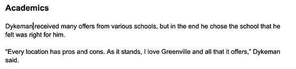 When I'm writing a story, especially one that's in-depth, I like to divide it into sections. For example, when I wrote about athletic and academic decisions for college-bound athletes, I divided the entire story into sections. Some included team culture, Financial Aid and Scholarships, and academics. All were key things an athlete had to consider when deciding where to commit. I feel that doing this not only makes it so much simpler for the writer but much more readable for the viewer.
